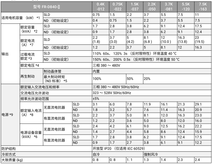 FR-D840-0.4K-012-60型號解讀:‘0.4K’表示適用電機容量(ND),‘012’表示變頻器額定電流(ND)。
