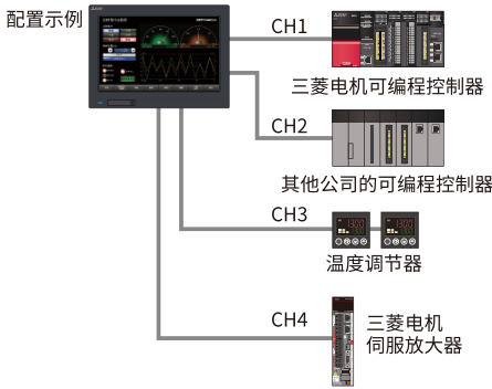 1臺GOT最多可控制4個通道的FA機器(可編程控制器、伺服、變頻器、溫度調節器等)。