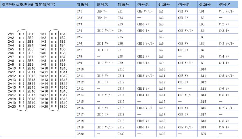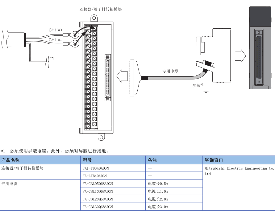 A/D轉換模塊中,可以使用Q68AD-G用的連接器/端子排轉換模塊及專用電纜。使用連接器/端子排轉換模塊的情況下,應按以下方式進行配線。