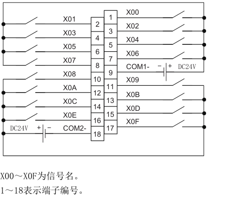 RX40NC6H參數說明:DC輸入16點 DC24V 4mA;響應時間20/50μs,0.1/0.2/0.4/0.6/1/5/10/20/70ms;8點1公共端;負公共端型;18點螺栓端子排。
