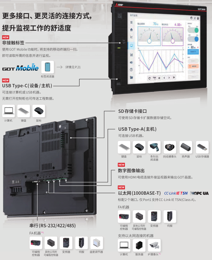 [特點] 以太網2ch;RS-232/422/485;USB設備/主機 USB Type-C;USB Type-A;非接觸摸標簽;數字圖像輸出;SD存儲卡;擴展接口;RAM(用戶存儲) 2GB(768MB);ROM(用戶存儲) 512MB(256MB)。