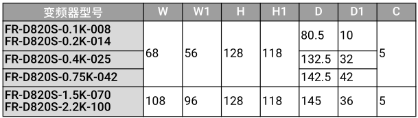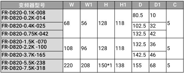 ·FR-D820-1.5K-070、FR-D820-2.2K-100、FR-D820-3.7K-165、FR-D820-5.5K-238、FR-D820-7.5K318